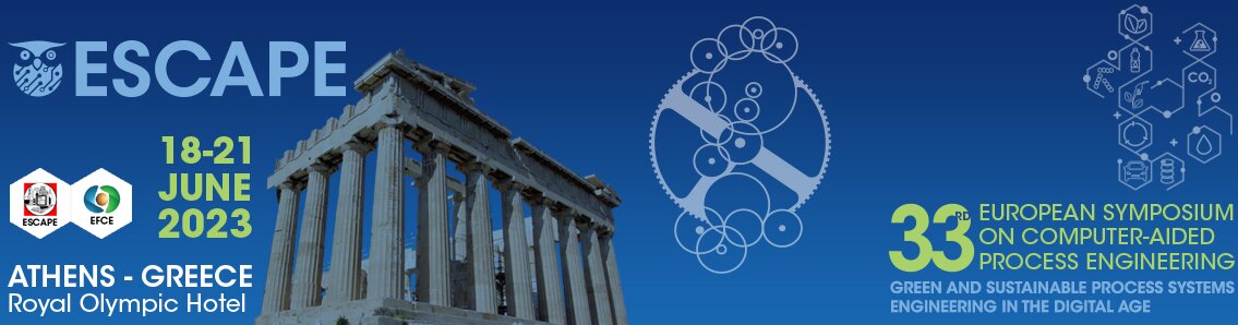 The 33rd European Symposium on Computer-Aided Process Engineering (ESCAPE-33) will take place in Athens from Sunday, June 18th to Wednesday, June 21st, 2023. The ESCAPE-33 event is organized under the auspices of the European Federation of Chemical Engineering (EFCE Event No. 776), the CAPE Working Party (CAPE-WP), the Technical Chamber of Greece, the Pan Hellenic Association of Chemical Engineers, and the National Technical University of Athens.